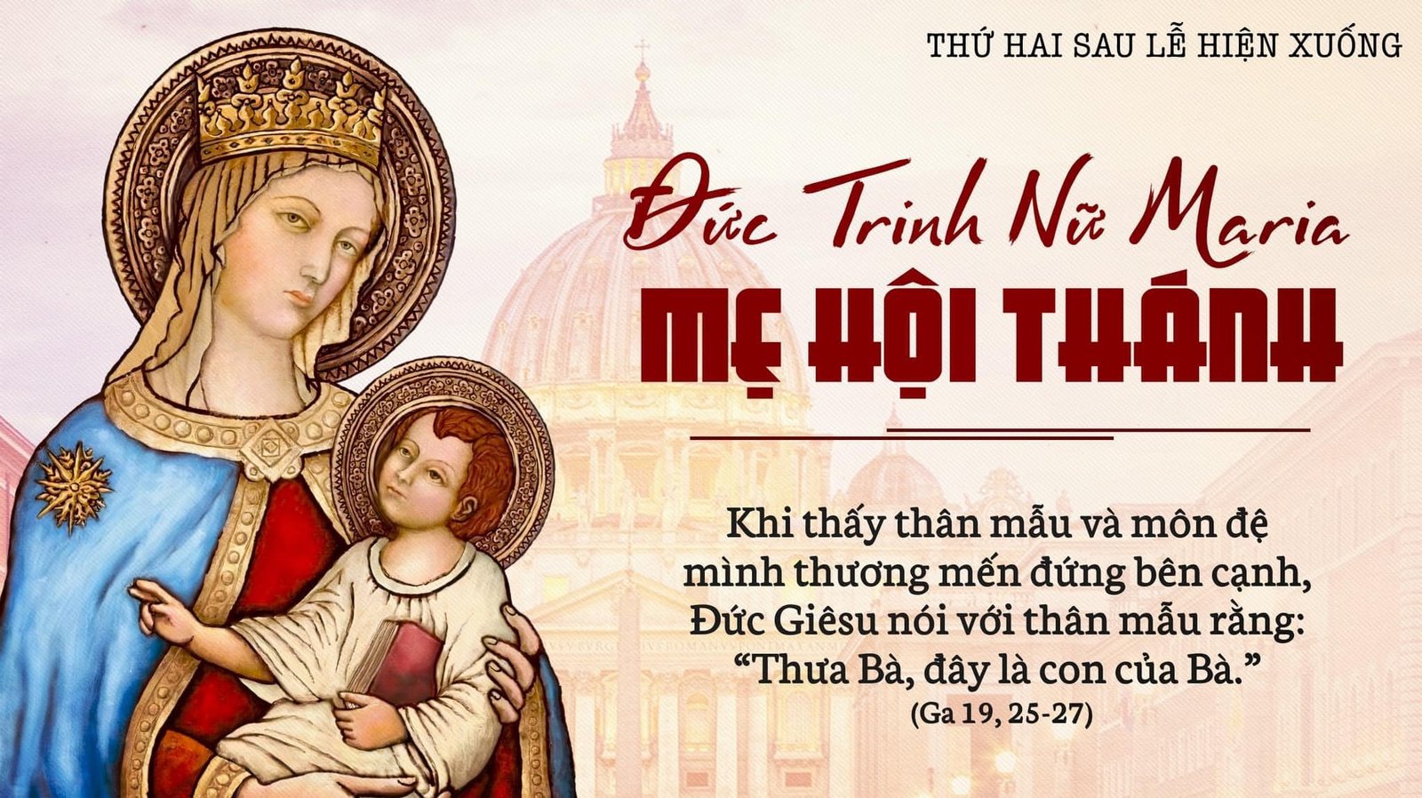 Đứng gần thập giá Đức Giêsu, có thân mẫu Người, chị của thân mẫu, bà Maria vợ ông Cơ-lô-pát, cùng với bà Maria Mác-đa-la. Khi thấy thân mẫu và môn đệ mình thương mến đứng bên cạnh, Đức Giêsu nói với thân mẫu rằng: “Thưa Bà, đây là con của Bà.” Rồi Người nói với môn đệ: “Đây là mẹ của anh.” Kể từ giờ đó, người môn đệ rước bà về nhà mình.