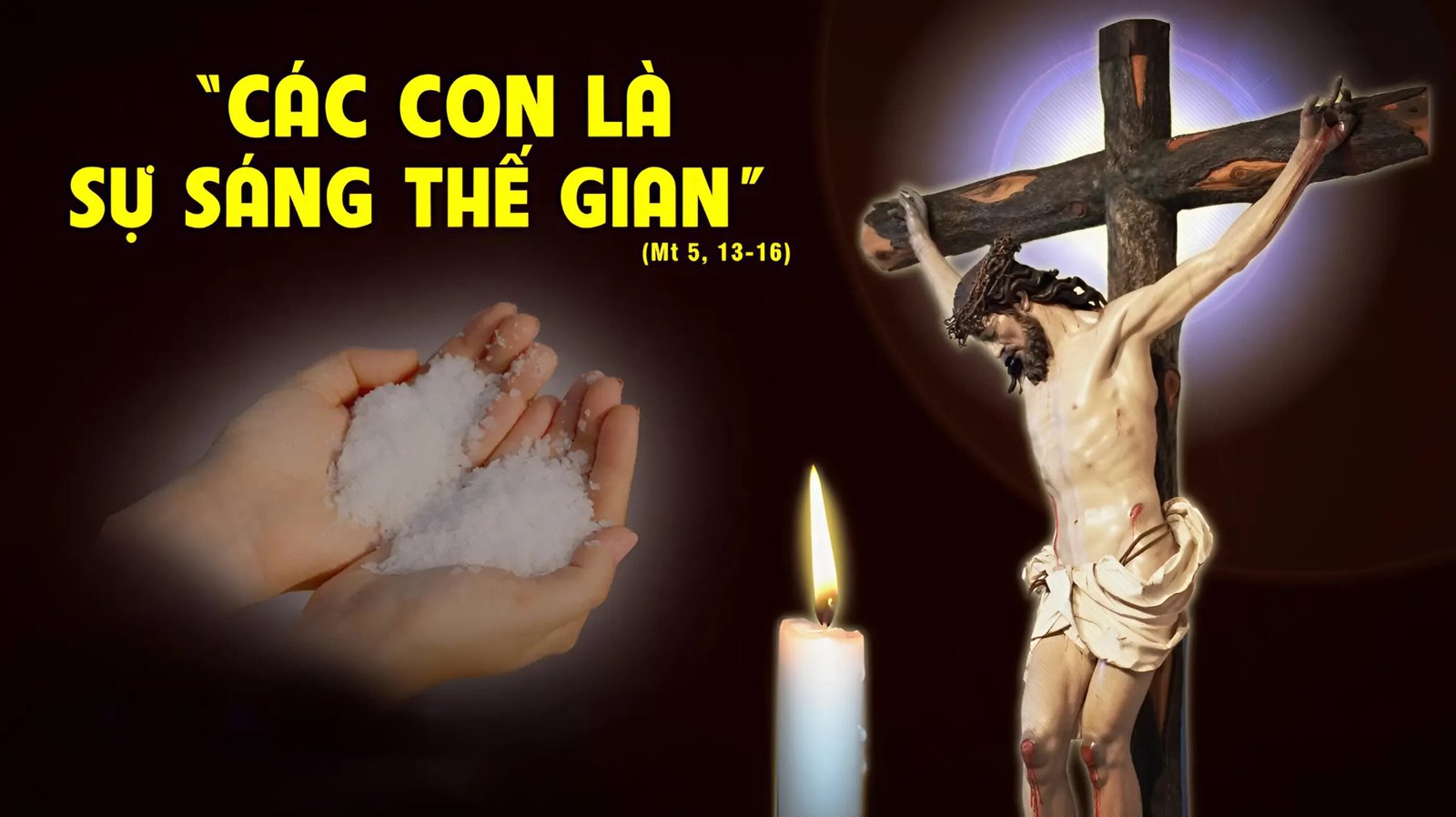 Khi ấy, Chúa Giêsu phán cùng các môn đệ rằng: “Các con là muối đất. Nếu muối đã lạt, người ta biết lấy gì mà ướp cho mặn lại? Muối đó không còn xử dụng vào việc chi nữa, chỉ còn ném ra ngoài cho người ta chà đạp lên nó. Các con là sự sáng thế gian. Một thành phố xây dựng trên núi, không thể che giấu được. Và người ta cũng không thắp đèn rồi để dưới đáy thùng, nhưng đặt nó trên giá đèn, hầu soi sáng cho mọi người trong nhà. Sự sáng của các con cũng phải chiếu giãi ra trước mặt thiên hạ, để họ xem thấy những việc lành của các con mà ngợi khen Cha các con trên trời”.