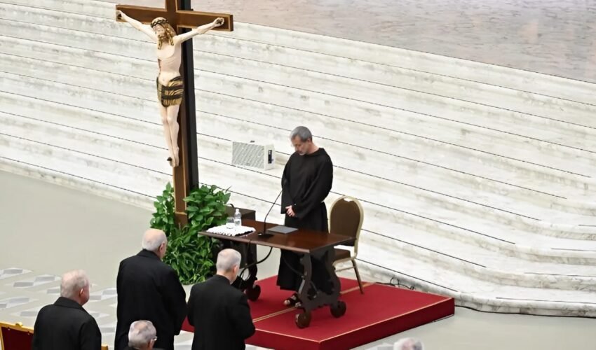 Trước khi bắt đầu bài suy niệm, Cha Pasolini đã gửi lời chào đến Đức Thánh Cha và mời gọi những người tham dự tiếp tục cầu nguyện cho ngài.