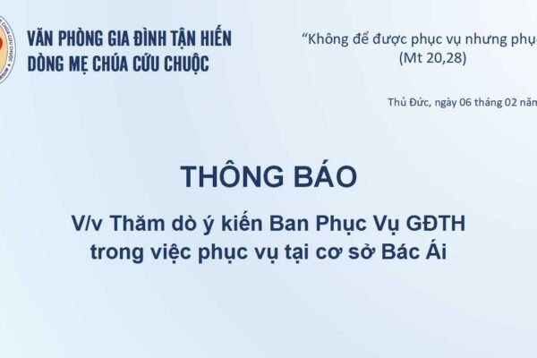 Gia Đình Tận Hiến Thông báo V/v thăm dò ý kiến Ban Phục Vụ GĐTH trong việc phục vụ tại cơ sở Bác Ái 1 tháng trước3 mins