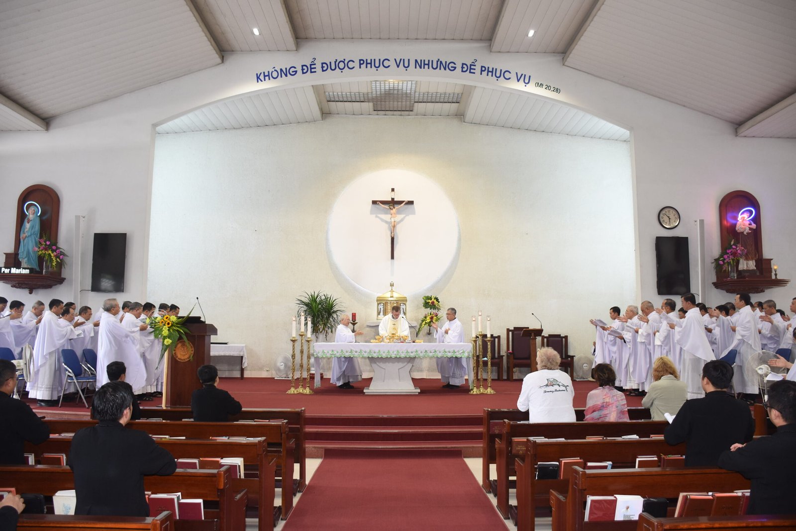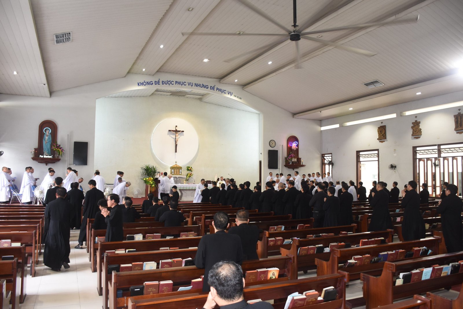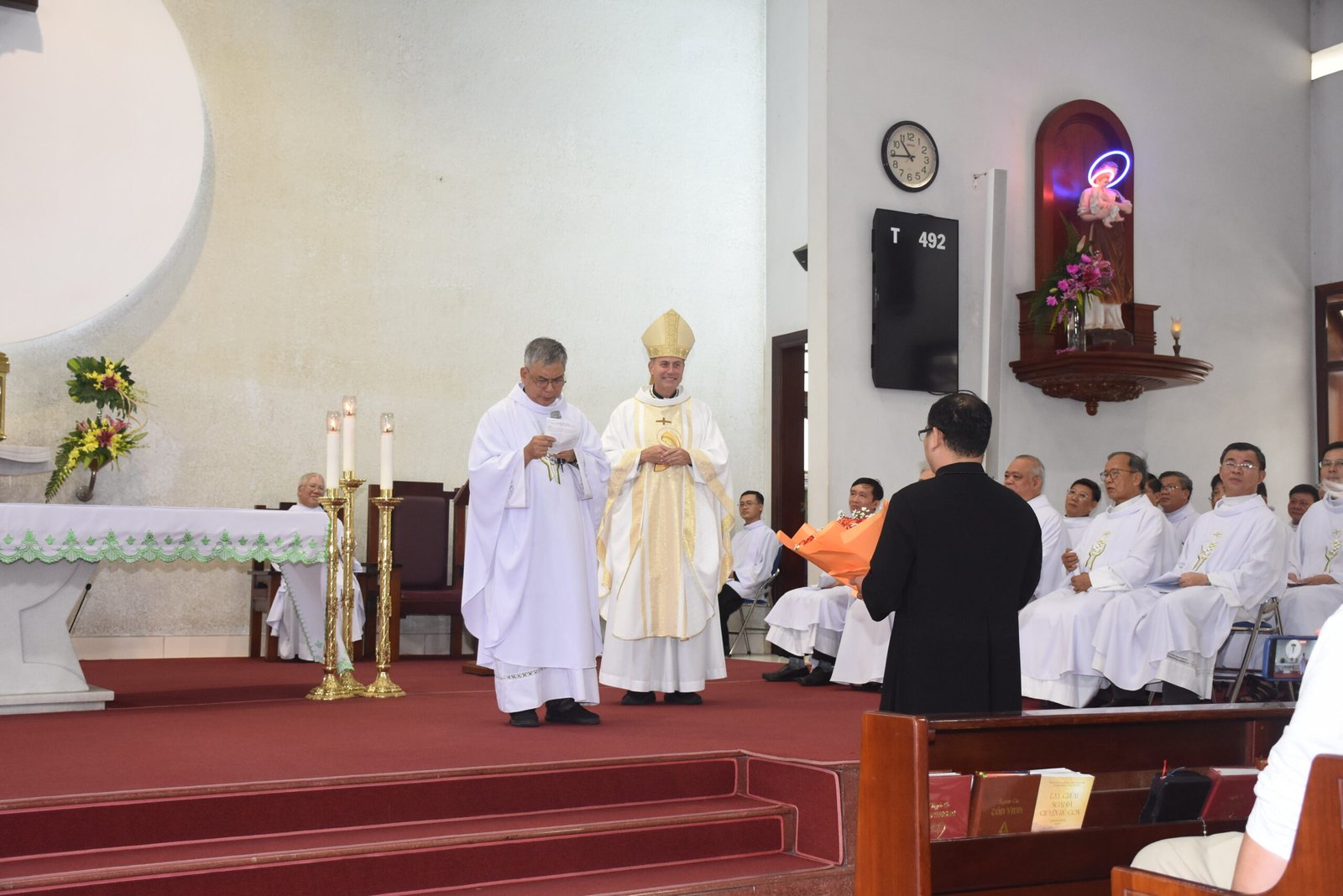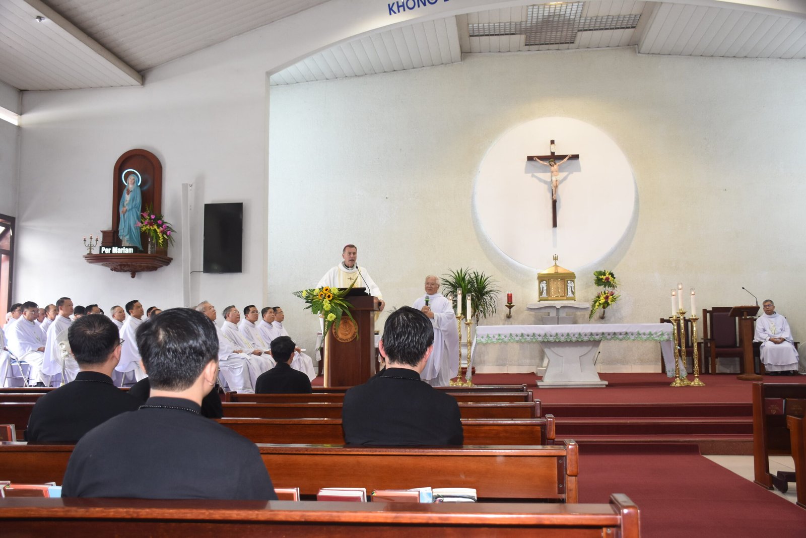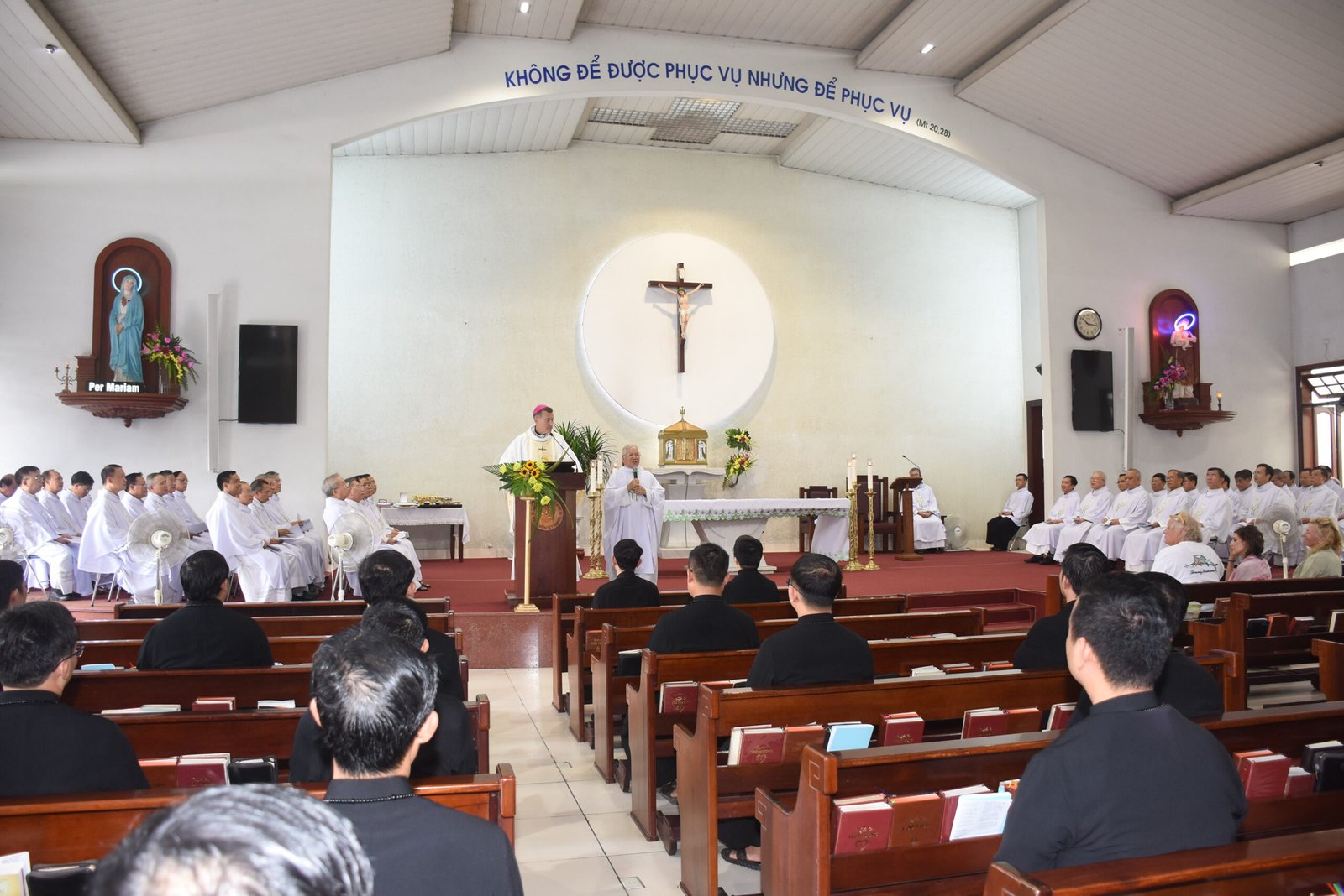 Sau buổi gặp gỡ, vào lúc 10g00, Đức cha Toups đã cùng cộng đoàn dâng Thánh lễ Tạ ơn tại nguyện đường của Hội Dòng. Trong bài giảng, ngài nhấn mạnh đến ý nghĩa của đời sống Thánh hiến như một chứng tá sống động cho Tin Mừng giữa lòng thế giới hôm nay. Nhất là sự hiện diện đông đảo của quý tu sĩ Dòng Mẹ Chúa Cứu Chuộc trong ngôi nguyện đường như lời chứng hùng hồn nhất cho sự dấn thân nhiệt thành vào công cuộc loan báo Tin Mừng của Giáo hội Việt Nam. Đồng thời, Đức cha Toups bày tỏ lòng biết ơn đối với những đóng góp quý báu của Dòng Mẹ Chúa Cứu Chuộc cho đời sống Đức tin của cộng đoàn Việt Nam tại Hoa Kỳ, cách riêng tại Giáo phận Beaumont. Ngài nhấn mạnh: “Sự hiện diện của các tu sĩ Dòng Mẹ Chúa Cứu Chuộc là món quà đặc biệt Thiên Chúa ban cho Giáo phận chúng tôi. Quý cha, quý thầy không chỉ thi hành tác vụ một cách tận tụy, mà còn mang lại sức sống và sự gắn kết văn hóa đức tin cho cộng đoàn di dân”. Sau cùng, để kết thúc bài giảng, ngài mời gọi các tu sĩ Dòng Mẹ Chúa Cứu Chuộc hãy mở lòng mình ra với Thánh linh như thánh Giuse – vị thánh đã để cho Thiên Chúa hoạt động nơi cuộc đời và sứ vụ của mình.