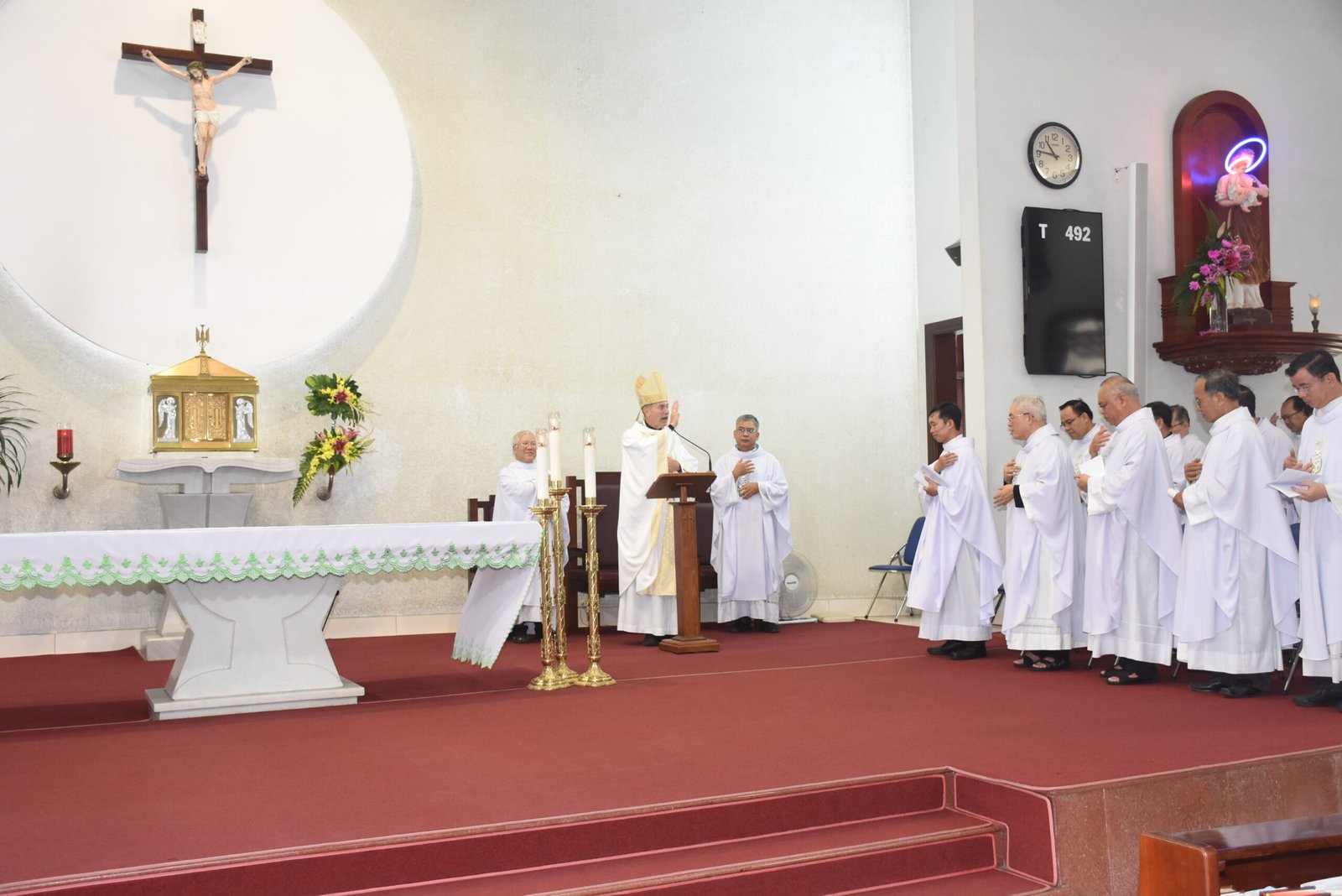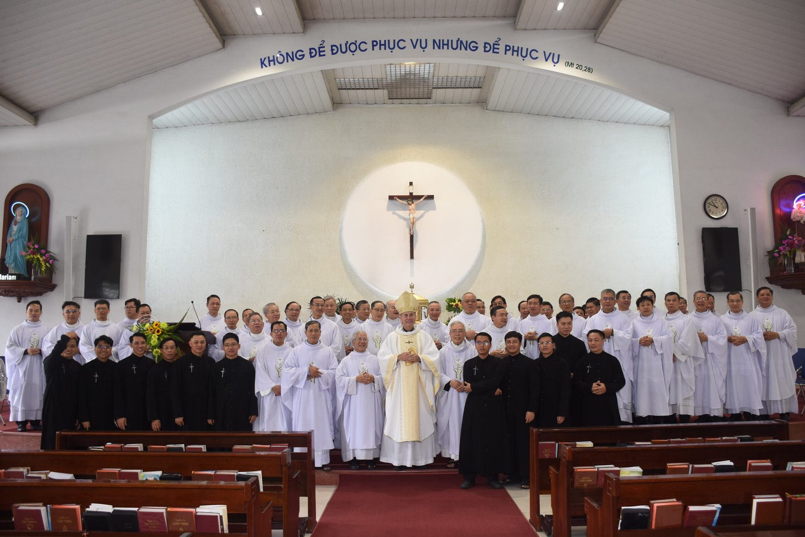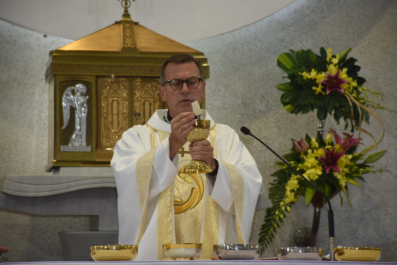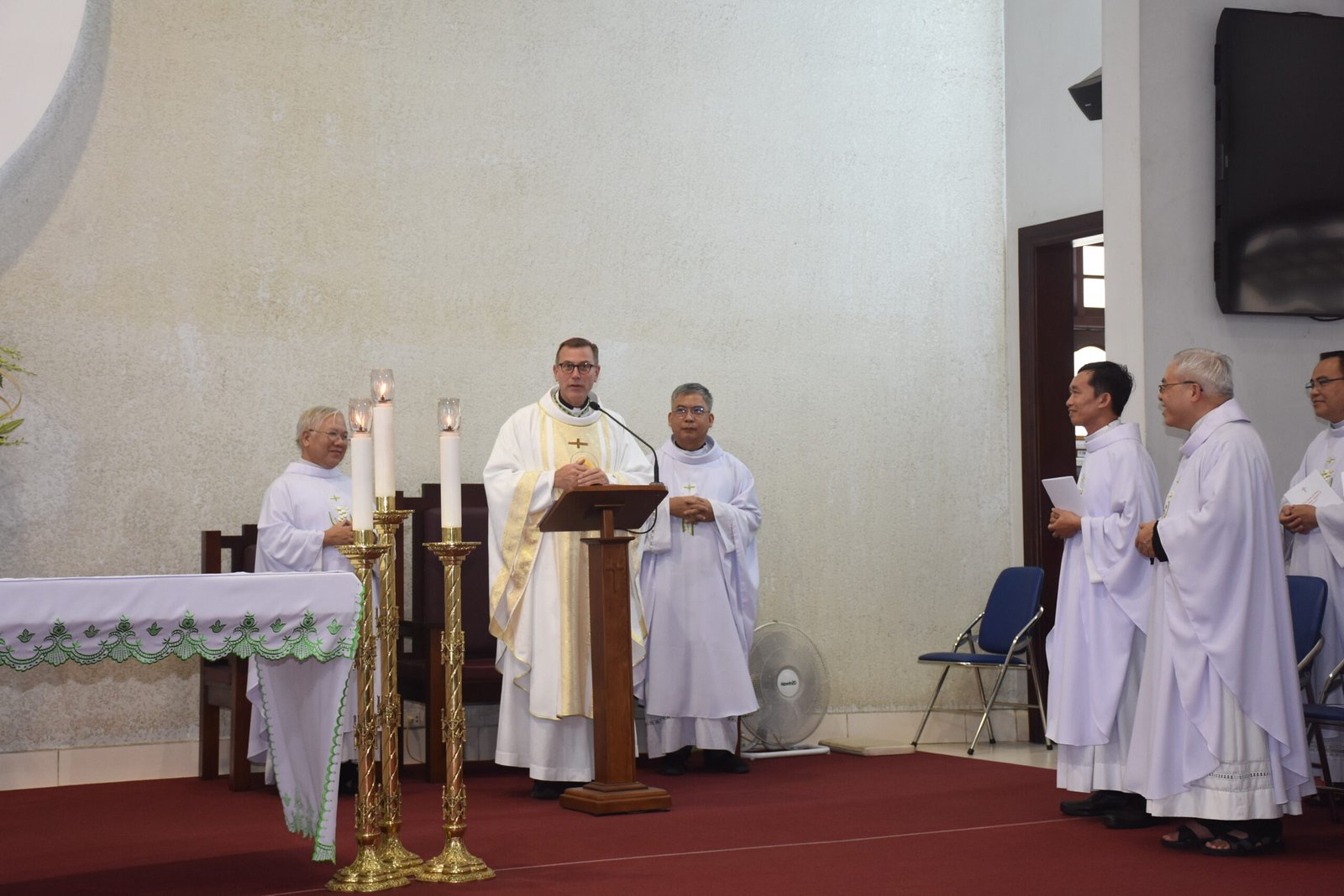 Sau buổi gặp gỡ, vào lúc 10g00, Đức cha Toups đã cùng cộng đoàn dâng Thánh lễ Tạ ơn tại nguyện đường của Hội Dòng. Trong bài giảng, ngài nhấn mạnh đến ý nghĩa của đời sống Thánh hiến như một chứng tá sống động cho Tin Mừng giữa lòng thế giới hôm nay. Nhất là sự hiện diện đông đảo của quý tu sĩ Dòng Mẹ Chúa Cứu Chuộc trong ngôi nguyện đường như lời chứng hùng hồn nhất cho sự dấn thân nhiệt thành vào công cuộc loan báo Tin Mừng của Giáo hội Việt Nam. Đồng thời, Đức cha Toups bày tỏ lòng biết ơn đối với những đóng góp quý báu của Dòng Mẹ Chúa Cứu Chuộc cho đời sống Đức tin của cộng đoàn Việt Nam tại Hoa Kỳ, cách riêng tại Giáo phận Beaumont. Ngài nhấn mạnh: “Sự hiện diện của các tu sĩ Dòng Mẹ Chúa Cứu Chuộc là món quà đặc biệt Thiên Chúa ban cho Giáo phận chúng tôi. Quý cha, quý thầy không chỉ thi hành tác vụ một cách tận tụy, mà còn mang lại sức sống và sự gắn kết văn hóa đức tin cho cộng đoàn di dân”. Sau cùng, để kết thúc bài giảng, ngài mời gọi các tu sĩ Dòng Mẹ Chúa Cứu Chuộc hãy mở lòng mình ra với Thánh linh như thánh Giuse – vị thánh đã để cho Thiên Chúa hoạt động nơi cuộc đời và sứ vụ của mình.