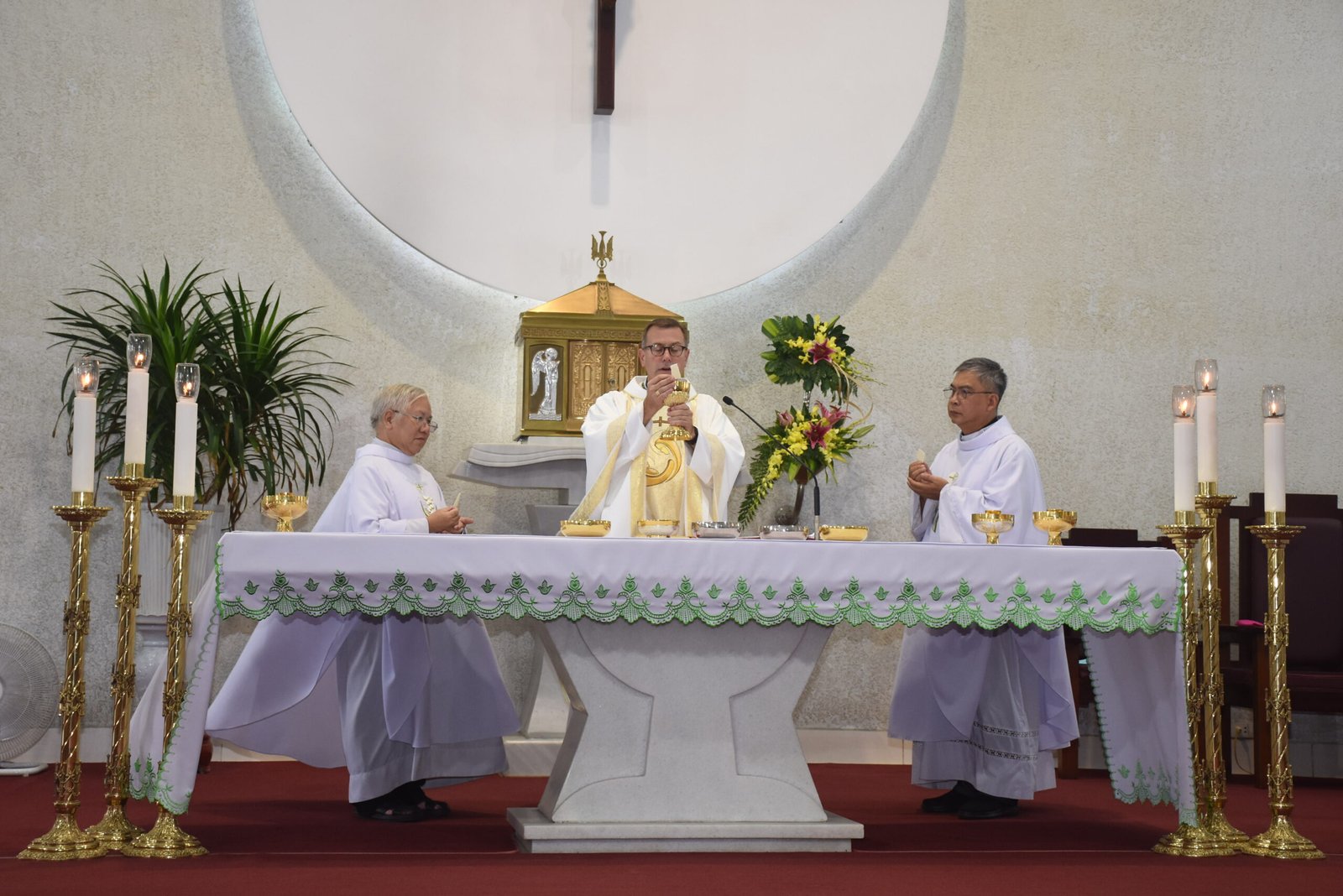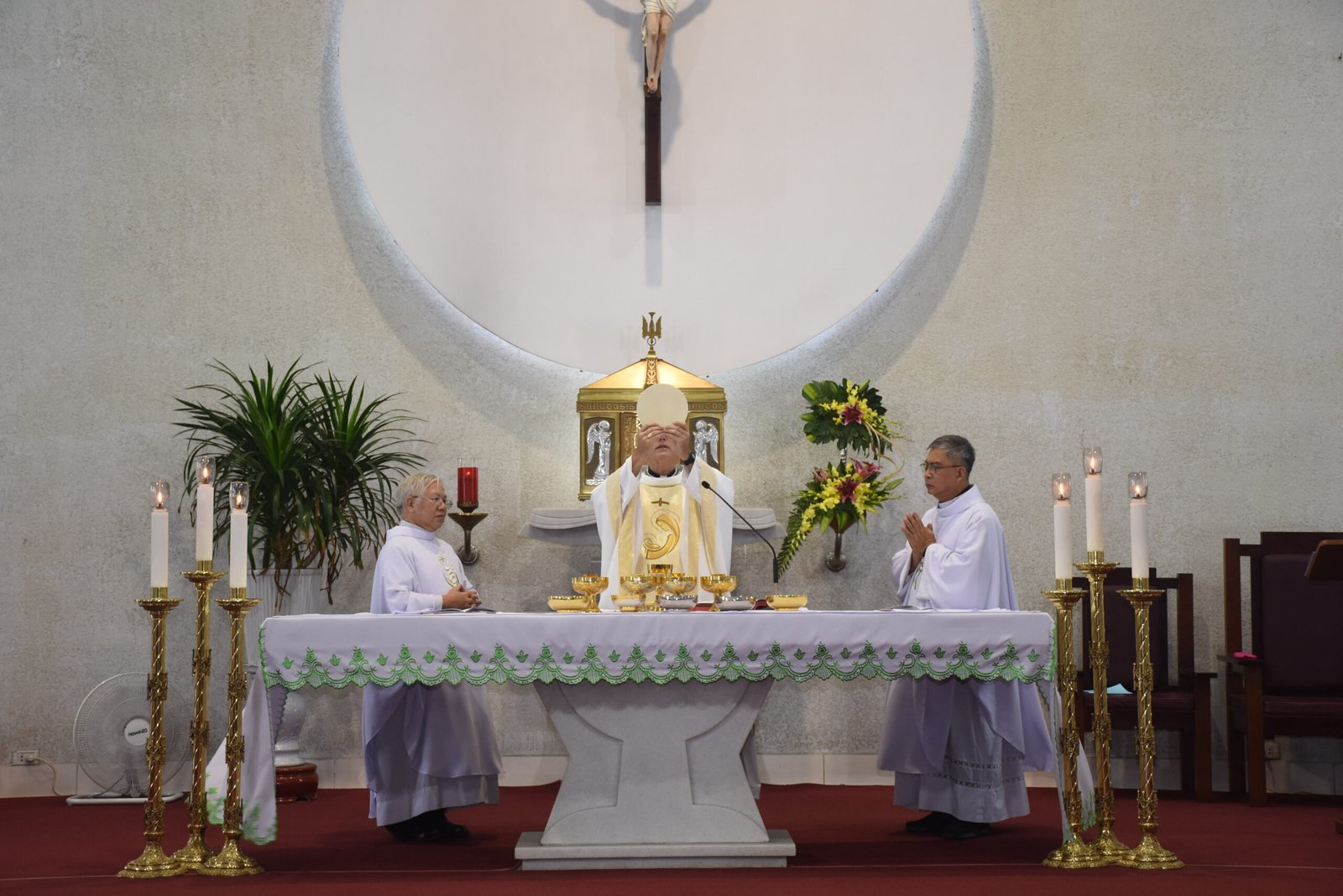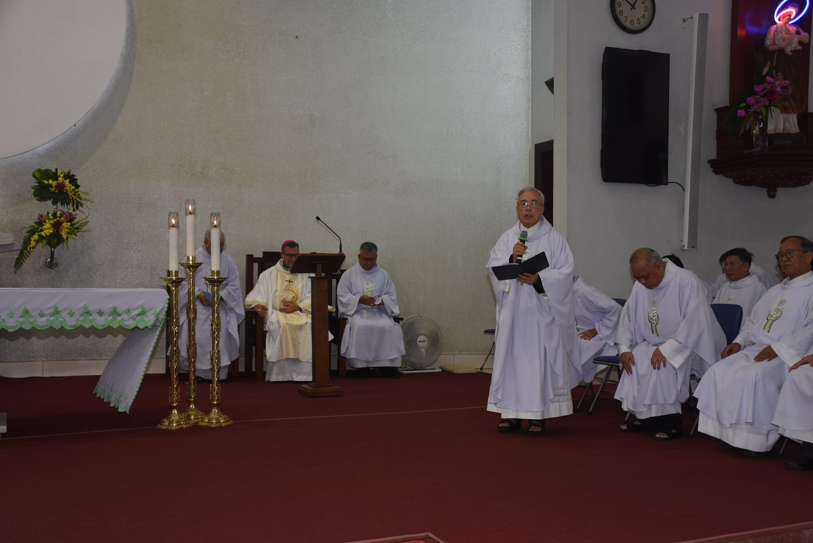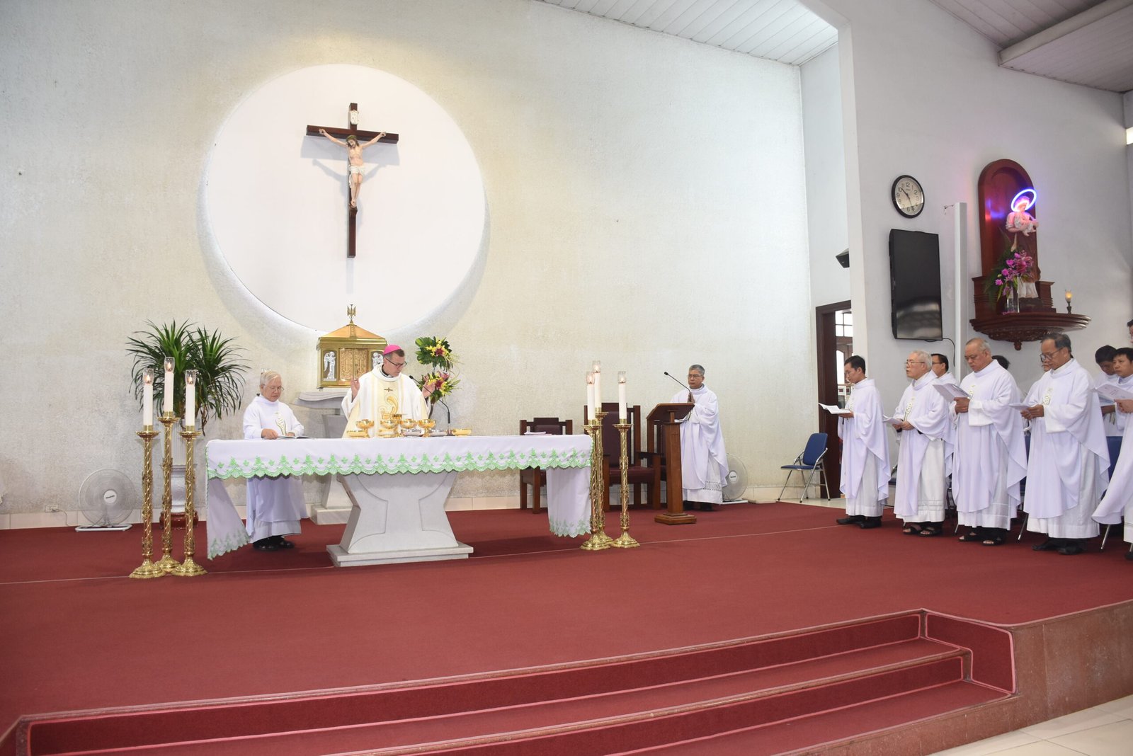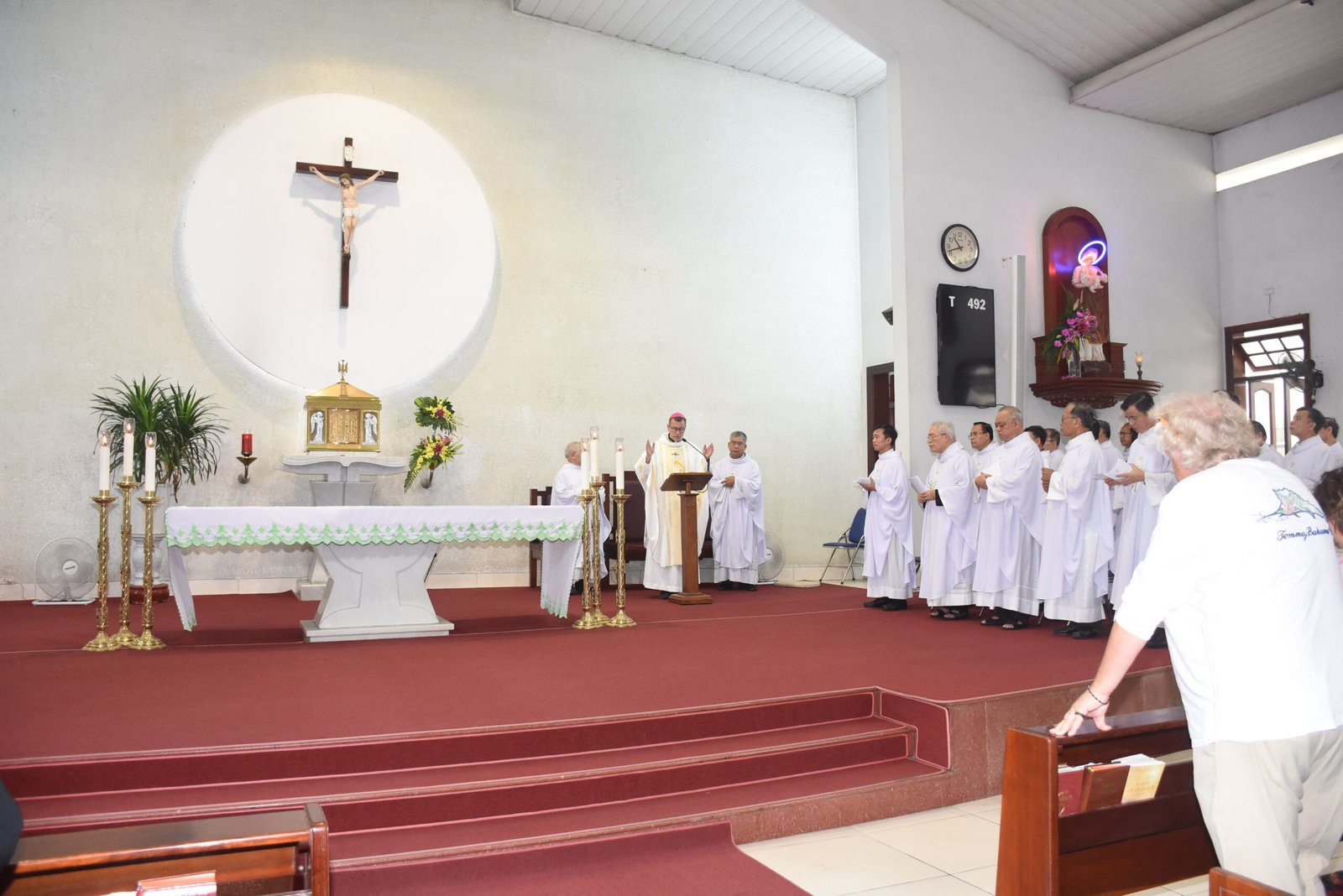 Sau buổi gặp gỡ, vào lúc 10g00, Đức cha Toups đã cùng cộng đoàn dâng Thánh lễ Tạ ơn tại nguyện đường của Hội Dòng. Trong bài giảng, ngài nhấn mạnh đến ý nghĩa của đời sống Thánh hiến như một chứng tá sống động cho Tin Mừng giữa lòng thế giới hôm nay. Nhất là sự hiện diện đông đảo của quý tu sĩ Dòng Mẹ Chúa Cứu Chuộc trong ngôi nguyện đường như lời chứng hùng hồn nhất cho sự dấn thân nhiệt thành vào công cuộc loan báo Tin Mừng của Giáo hội Việt Nam. Đồng thời, Đức cha Toups bày tỏ lòng biết ơn đối với những đóng góp quý báu của Dòng Mẹ Chúa Cứu Chuộc cho đời sống Đức tin của cộng đoàn Việt Nam tại Hoa Kỳ, cách riêng tại Giáo phận Beaumont. Ngài nhấn mạnh: “Sự hiện diện của các tu sĩ Dòng Mẹ Chúa Cứu Chuộc là món quà đặc biệt Thiên Chúa ban cho Giáo phận chúng tôi. Quý cha, quý thầy không chỉ thi hành tác vụ một cách tận tụy, mà còn mang lại sức sống và sự gắn kết văn hóa đức tin cho cộng đoàn di dân”. Sau cùng, để kết thúc bài giảng, ngài mời gọi các tu sĩ Dòng Mẹ Chúa Cứu Chuộc hãy mở lòng mình ra với Thánh linh như thánh Giuse – vị thánh đã để cho Thiên Chúa hoạt động nơi cuộc đời và sứ vụ của mình.