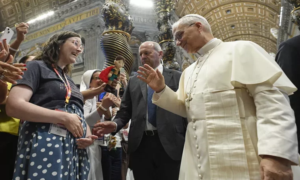 Đức Giáo Hoàng Lêô XIV chào thăm các tham dự viên sau Thánh lễ Năm Thánh dành cho các nhà truyền giáo kỹ thuật số và những người Công giáo có ảnh hưởng, ngày 29-7-2025, tại Đền thờ Thánh Phêrô, Vatican. | Daniel Ibañez/EWTN News