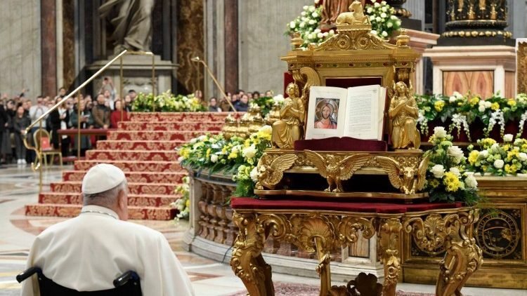 Anh chị em thân mến, thật là một sự trùng hợp hạnh phúc! Vào Chúa Nhật Lời Chúa, vẫn còn ở đầu Năm Thánh, trang Phúc Âm này của thánh Luca được công bố, trong đó Chúa Giêsu mặc khải mình là Đấng Mêsia “được thánh hiến bằng việc xức dầu” (câu 18) và được sai đến “công bố năm hồng ân của Chúa” (câu 19)! Chúa Giêsu là Ngôi Lời Hằng Sống, trong Người mọi lời Kinh Thánh đều được ứng nghiệm trọn vẹn. Và chúng ta, trong Phụng vụ Thánh hôm nay, là những người cùng thời của Người: chúng ta cũng vậy, với sự kinh ngạc, đầy ngạc nhiên, mở lòng và tâm trí để lắng nghe Người, bởi vì “chính Người là Đấng lên tiếng khi Kinh Thánh được đọc trong Giáo hội” ( CONC . VAT. II, Hiến chế Sacrosanctum Concilium, 7). Tôi chỉ nói một từ: kinh ngạc. Khi chúng ta nghe Tin Mừng, Lời Chúa, không chỉ là nghe và hiểu, không… Nó phải chạm đến trái tim, và tạo ra điều mà tôi gọi là “sự kinh ngạc”. Lời Chúa luôn làm chúng ta ngạc nhiên, luôn đổi mới chúng ta, đi vào lòng chúng ta và luôn đổi mới chúng ta.