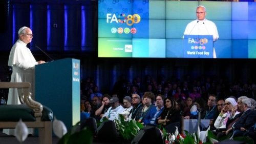Khen ngợi khẩu hiệu của Ngày Lương thực Thế giới năm nay, “Cùng nắm tay vì một tương lai và dinh dưỡng tốt hơn”, Đức Thánh Cha nói: “Trong thời khắc lịch sử đầy chia rẽ và mâu thuẫn sâu sắc, cảm giác đoàn kết bởi sợi dây hợp tác không chỉ là một lý tưởng cao đẹp mà còn là một lời kêu gọi hành động kiên quyết… Đã đến lúc cần một cam kết mới, một cam kết tác động tích cực đến cuộc sống của những người đang đói khát và mong đợi chúng ta có những hành động cụ thể giúp họ thoát khỏi cảnh khốn cùng”. Ngài nói rằng lời kêu gọi cùng nhau bước đi trong sự hòa hợp huynh đệ phải trở thành nguyên tắc chỉ đạo cho các chính sách và đầu tư, bởi vì chỉ thông qua sự hợp tác chân thành và liên tục, chúng ta mới có thể đạt được an ninh lương thực công bằng và dễ tiếp cận cho tất cả mọi người”, điều là một quyền chứ không phải là một đặc quyền.