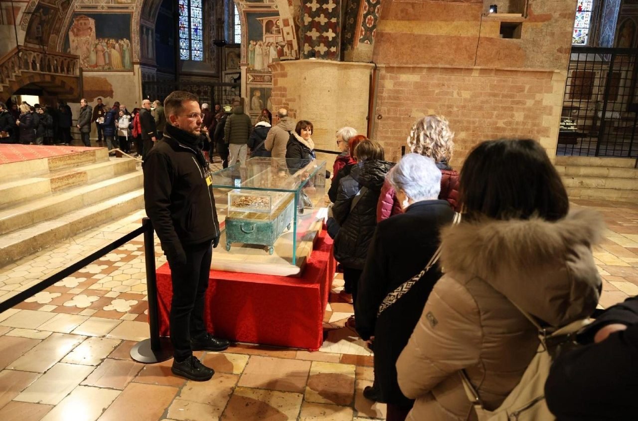 Dòng người tiến qua những bức bích họa thế kỷ XIII–XIV của Cimabue và Giotto, rồi dừng lại trước hòm kính được bảo vệ bởi lớp kính nhựa plexiglass. Nhiều người quỳ gối, hôn lên lớp kính, hoặc để lại ý nguyện trong các hộp thư cầu nguyện. Không ít người xúc động khi được đứng cách di hài vị thánh chỉ một bước chân.