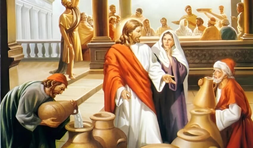 Khi ấy có Tiệc cưới tại Cana. Đức Mẹ và Chúa Giêsu cũng được mời. Tiệc đang vui thì hết rượu. Đức Mẹ ghé tai nói nhỏ với Chúa Giêsu rằng: “Họ hết rượu rồi” (Ga 2,3). Nhưng Chúa Giêsu trả lời ngay: Thưa Bà “Việc đó đâu có liên can gì đến Bà và Con, Giờ Con chưa đến”.