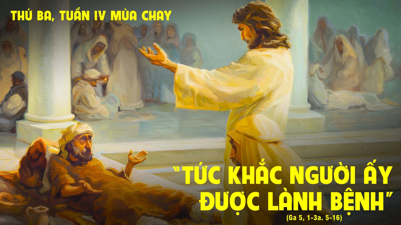 Hôm đó là ngày lễ của người Do-thái, Chúa Giêsu lên Giêrusalem. Tại Giêrusalem, gần cửa “Chiên”, có một cái hồ, tiếng Do-thái gọi là Bếtsaiđa, chung quanh có năm hành lang. Trong các hành lang này, có rất nhiều người đau yếu, mù loà, què quặt, bất toại nằm la liệt. Trong số đó, có một người nằm đau liệt đã ba mươi tám năm. Khi Chúa Giêsu thấy người ấy nằm đó và biết anh đã đau từ lâu, liền hỏi: “Anh muốn được lành bệnh không?” Người đó thưa: “Thưa Ngài, tôi không được ai đem xuống hồ, mỗi khi nước động. Khi tôi lết tới, thì có người xuống trước tôi rồi”. Chúa Giêsu nói: “Anh hãy đứng dậy vác chõng mà về”. Tức khắc người ấy được lành bệnh. Anh ta vác chõng và đi. Nhưng hôm đó lại là ngày Sabbat, nên người Do-thái bảo người vừa được khỏi bệnh rằng: “Hôm nay là ngày Sabbat, anh không được phép vác chõng”. Anh ta trả lời: “Chính người chữa tôi lành bệnh bảo tôi: “Vác chõng mà đi”. Họ hỏi: “Ai là người đã bảo anh “Vác chõng mà đi?” Nhưng kẻ đã được chữa lành không biết Người là ai, vì Chúa Giêsu đã lánh vào đám đông tụ tập nơi đó.