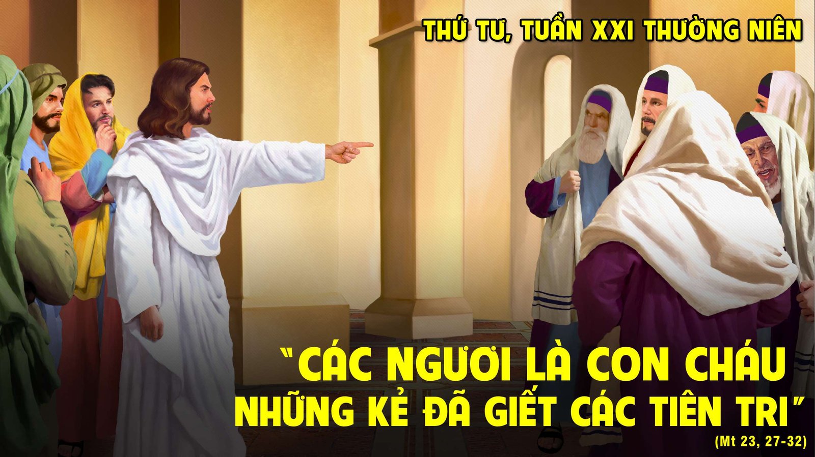 Khi ấy, Chúa Giêsu phán rằng: “Khốn cho các ngươi, hỡi những luật sĩ và biệt phái giả hình: vì các ngươi giống như mồ mả tô vôi, bên ngoài có vẻ tốt đẹp, nhưng bên trong đầy xương kẻ chết và mọi thứ dơ nhớp. Các ngươi cũng thế, bên ngoài, các ngươi có vẻ là người công chính, nhưng bên trong, các ngươi đầy sự giả hình và gian ác. Khốn cho các ngươi, hỡi những luật sĩ và biệt phái giả hình, các ngươi xây đắp phần mộ các tiên tri, trang hoàng mồ mả những người công chính, và các ngươi nói rằng: “Nếu chúng tôi sống thời cha ông chúng tôi, ắt chúng tôi không thông đồng với các ngài trong việc đổ máu các tiên tri”. Vì thế, các ngươi tự chứng thực các ngươi là con cháu những kẻ đã giết các tiên tri. Vậy các ngươi cứ đong cho đầy đấu của cha ông các ngươi”.