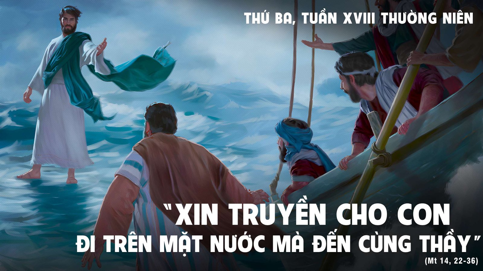 Canh tư đêm tối, Người đi trên mặt biển mà đến với các ông. Thấy Người đi trên mặt biển, các ông hoảng hồn mà nói rằng: “Ma kìa” và các ông sợ hãi kêu la lớn tiếng. Lập tức, Chúa Giêsu nói với các ông rằng: “Hãy yên tâm. Thầy đây, đừng sợ”. Phêrô thưa lại rằng: “Lạy Thầy, nếu quả là Thầy, thì xin truyền cho con đi trên mặt nước mà đến cùng Thầy”. Chúa phán: “Hãy đến”. Phêrô xuống khỏi thuyền bước đi trên mặt nước mà đến cùng Chúa Giêsu. Khi thấy gió mạnh, ông sợ hãi và sắp chìm xuống nên la lên rằng: “Lạy Thầy, xin cứu con”. Lập tức, Chúa Giêsu giơ tay nắm lấy ông mà nói: “Người hèn tin, tại sao lại nghi ngờ?” Khi cả hai đã lên thuyền thì gió liền yên lặng. Những người ở trong thuyền đến lạy Người mà rằng: “Thật, Thầy là Con Thiên Chúa!”