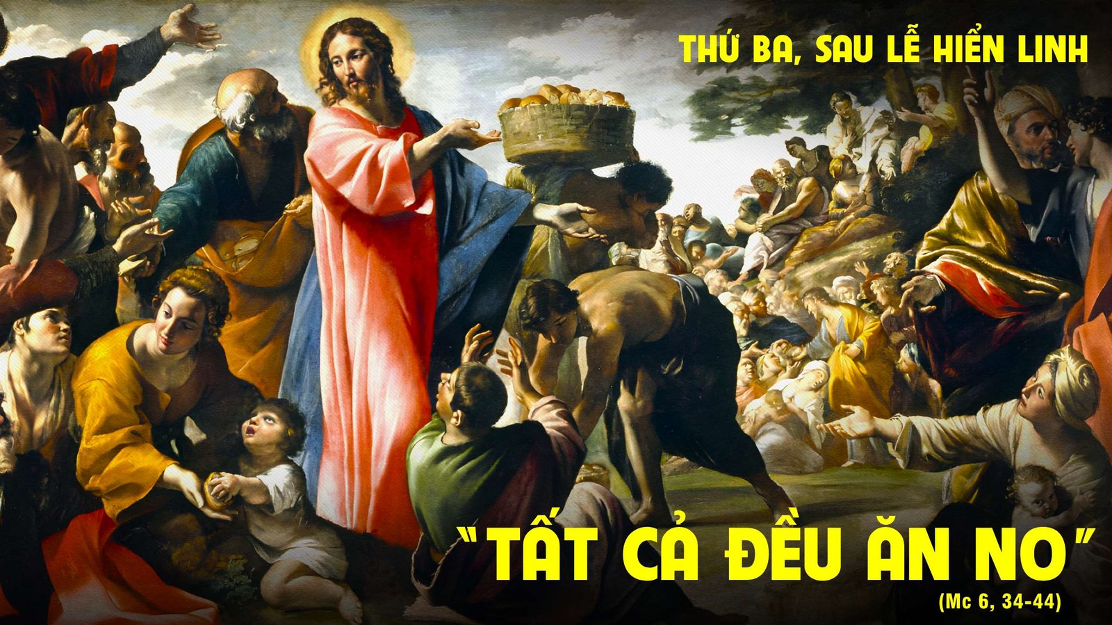 Khi ấy, Chúa Giêsu xem thấy dân chúng đông đảo thì động lòng thương xót họ, vì họ như chiên không người chăn giữ, và Người bắt đầu giảng dạy họ nhiều điều. Và khi giờ đã muộn, các môn đệ đến thưa Người rằng: “Chỗ này hoang vắng, mà giờ đã muộn, xin Thầy giải tán họ, để họ đi tới các làng các xóm gần đây mà mua gì ăn”. Chúa Giêsu trả lời họ rằng: “Các con hãy cho họ ăn đi”. Họ thưa Người: “Chúng con phải đi mua đến hai trăm đồng bạc bánh để phát cho họ ăn”. Người nói với họ: “Các con có mấy cái bánh? Hãy đi xem”. Khi biết được rồi, họ thưa: “Có năm cái bánh và hai con cá”. Người ra lệnh cho họ bảo mọi người ngồi xuống làm thành từng nhóm trên cỏ xanh. Họ ngồi xuống từng nhóm, chỗ một trăm, chỗ năm mươi. Người cầm năm cái bánh và hai con cá, ngước mắt lên trời mà chúc tụng, rồi bẻ bánh ra và trao cho các môn đệ, để họ phân phát cho người ta; còn hai con cá, Người cũng chia cho mọi người. Và tất cả đều ăn no. Mụn bánh và cá còn dư lại, người ta lượm được mười hai thúng đầy. Mà số người ăn là năm ngàn người.