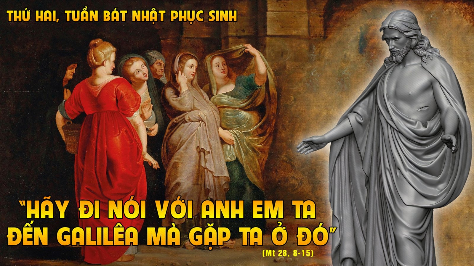 Khi ấy, các bà vội ra khỏi mồ vừa sợ lại vừa hớn hở vui mừng, chạy báo tin cho các môn đệ Chúa. Và này Chúa Giêsu đón gặp các bà, Người nói: “Chào các bà”. Các bà liền lại gần ôm chân Người và phục lạy. Bấy giờ Chúa Giêsu bảo: “Các bà đừng sợ. Hãy đi báo tin cho các anh em Ta phải trở về Galilêa, rồi ở đó họ sẽ gặp Ta”.