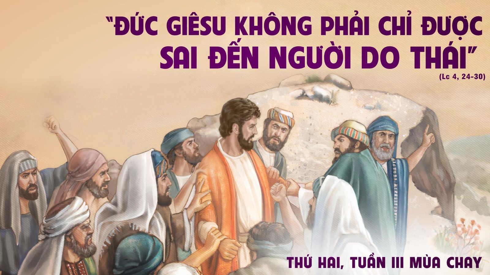 Vừa nghe đến đó, mọi người trong hội đường đều đầy phẫn nộ. Họ đứng dậy, đẩy Người ra khỏi thành và dẫn Người đến một triền đồi, nơi họ xây thành, để xô Người xuống vực. Nhưng Người tiến qua giữa họ mà đi.
