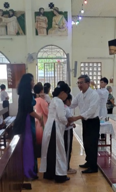 Trong Thánh lễ, Cha chủ tế đã chia sẻ: “Truyền giáo không phải là chinh phục, mà là yêu thương. Chúng ta không chỉ mang Chúa đến cho người khác, nhưng còn giúp họ nhận ra Chúa đã ở giữa họ từ lâu.” Lời nhắn nhủ ấy như sợi chỉ đỏ nối kết tất cả: những người tân tòng, các tu sĩ Dòng Mẹ Chúa Cứu Chuộc, và cộng đoàn dân Chúa tại Giáo xứ Mỹ An – tất cả đều là những người cùng lên đường. Bởi truyền giáo không phải là việc của một nhóm nhỏ, mà là hơi thở của toàn thể Hội Thánh.