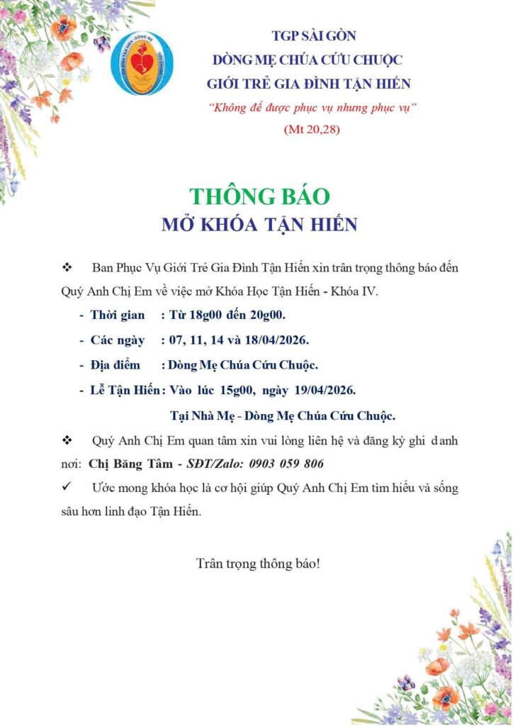 Gia Đình Tận HiếnTHÔNG BÁO: MỞ KHÓA TẬN HIẾN – KHÓA IV 1 giờ trước1 mins Chia sẻ qua: Điều hướng bài viết Trước Vatican bắt đầu công trình bảo trì bức bích họa “Cuộc Phán xét cuối cùng” của Michelangelo tại Nhà nguyện SistineTiếp theo TÂM TÌNH TẠ ƠN VÀ BIẾT ƠN