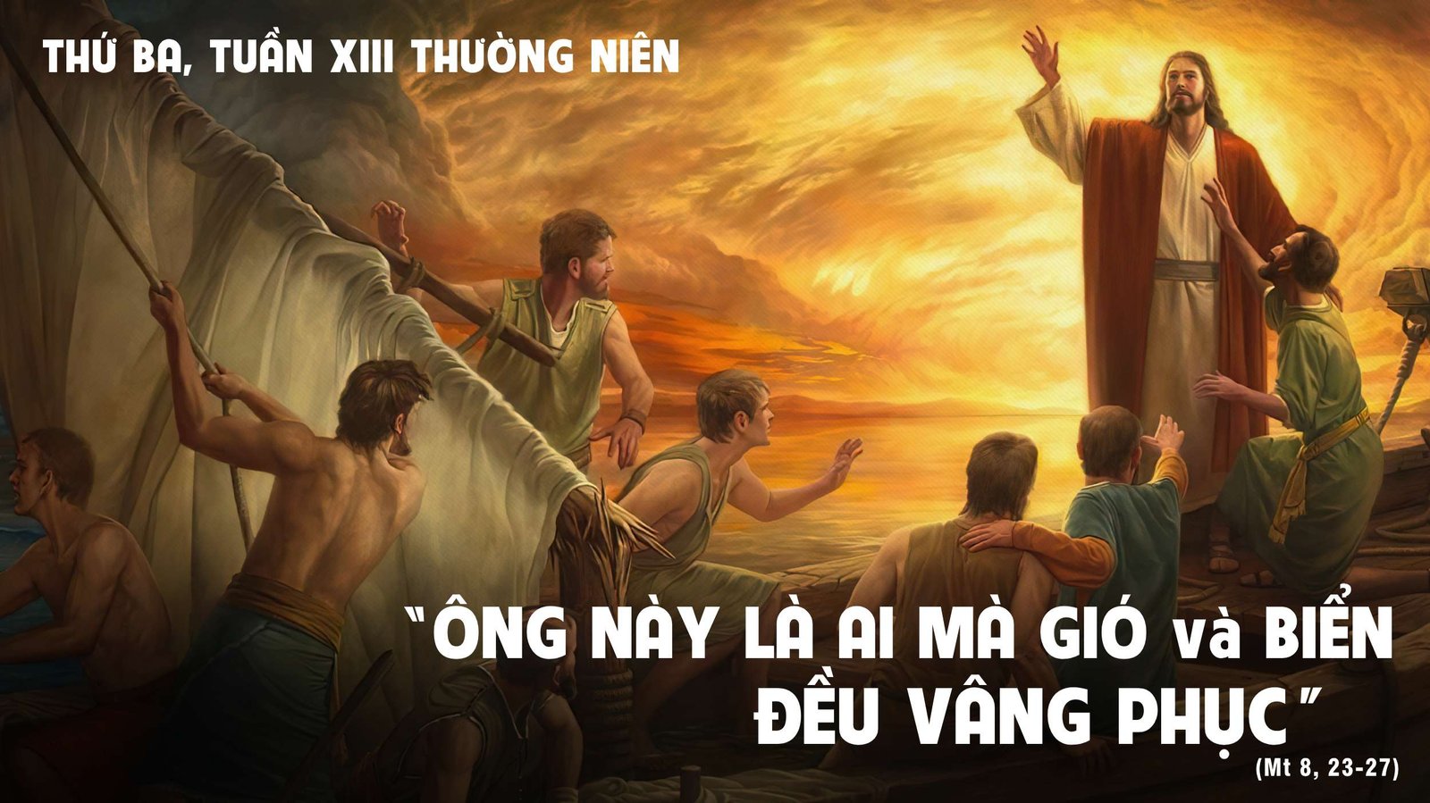 Khi ấy, Chúa Giêsu xuống thuyền, có các môn đệ theo Người. Và đây biển động dữ dội, đến nỗi sóng phủ lên thuyền, thế mà Người vẫn ngủ. Các môn đệ lại gần đánh thức Người dậy mà rằng: “Lạy Thầy, xin cứu lấy chúng con kẻo chết mất!” Chúa phán: “Hỡi những kẻ yếu lòng tin! Sao các con nhát sợ?” Bấy giờ Người chỗi dậy, truyền lệnh cho gió và biển. Và biển yên lặng như tờ! Cho nên những người ấy kinh ngạc mà rằng: “Ông này là ai mà gió và biển đều vâng phục?”
