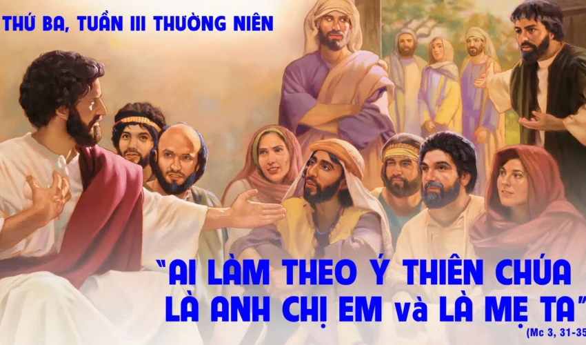 Khi ấy, mẹ Chúa Giêsu và anh em Người đến và đứng ở ngoài sai người vào mời Chúa ra. Bấy giờ có đám đông ngồi chung quanh Người và họ trình với Người rằng: “Kìa mẹ và anh em Thầy ở ngoài kia đang tìm Thầy”. Người trả lời rằng: “Ai là mẹ Ta? Ai là anh em Ta?” Rồi đưa mắt nhìn những người ngồi vòng quanh, Người nói: “Đây là mẹ Ta và anh em Ta. Vì ai làm theo ý Thiên Chúa, thì người ấy là anh chị em và là mẹ Ta”.