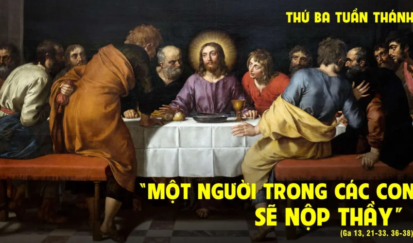 Khi ấy, (Chúa Giêsu đang ngồi ăn với các môn đệ), tâm hồn Người bị xao xuyến, nên Người tuyên bố: “Thật, Thầy nói thật cho các con biết, một người trong các con sẽ nộp Thầy”. Các môn đệ nhìn nhau phân vân không biết Người nói về ai. Có một môn đệ được Chúa Giêsu yêu quý, đang ở bàn ăn gần lòng Chúa Giêsu. Vậy Phêrô làm hiệu cho môn đệ ấy và nói: “Hỏi xem Thầy nói về ai đó”. Môn đệ ấy nghiêng mình sát ngực Chúa Giêsu và hỏi Người: “Thưa Thầy, ai vậy?” Chúa Giêsu trả lời: “Thầy chấm miếng bánh trao cho ai là người đó”. Và Người chấm một miếng bánh trao cho Giuđa, con Simon Iscariô. Ăn miếng bánh rồi, Satan nhập vào hắn. Chúa Giêsu nói với hắn: “Con tính làm gì thì làm mau đi”. Nhưng những người đang ngồi ăn không một ai hiểu được vì sao Người lại nói với hắn như vậy. Có nhiều người tưởng tại Giuđa giữ túi tiền, nên Chúa Giêsu bảo hắn: Hãy mua những gì chúng ta cần dùng trong dịp lễ, hoặc Người bảo hắn bố thí cho người nghèo. Vậy sau khi nhận miếng bánh đó, Giuđa liền đi ra. Bấy giờ là đêm tối. Khi Giuđa đi rồi, Chúa Giêsu phán: “Bây giờ Con Người được vinh hiển, và Thiên Chúa đã được vinh hiển nơi Người. Nếu Thiên Chúa được vinh hiển nơi Người, thì Thiên Chúa lại cho Người được vinh hiển nơi chính Mình, và Thiên Chúa sẽ cho Người được vinh hiển! Các con yêu quý, Thầy chỉ còn ở với các con một ít nữa. Các con sẽ tìm Thầy, và như Thầy đã nói với người Do-thái: “Nơi Ta đi, các ngươi không thể đến được”, nay Thầy cũng nói với các con như vậy”.