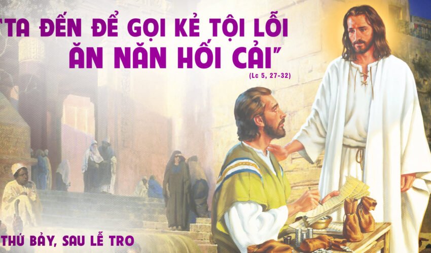 Khi ấy, Chúa Giêsu trông thấy một người quan thuế tên là Lêvi đang ngồi ở bàn thu thuế, Ngài bảo ông: “Hãy đi theo Ta”. Ông liền bỏ mọi sự đứng dậy theo Người. Lêvi đã dọn một bữa tiệc linh đình thết đãi Người tại nhà ông. Có đông người thu thuế và nhiều người khác cùng ngồi ăn với các ngài. Những người biệt phái và các luật sĩ của họ lẩm bẩm với các môn đệ của Người rằng: “Sao các người lại ăn uống với những người thu thuế và tội lỗi như vậy?” Chúa Giêsu trả lời họ rằng: “Những ai mạnh khoẻ không cần tới thầy thuốc, chỉ những người đau yếu mới cần thôi. Ta đến không phải để kêu mời người công chính, nhưng để gọi kẻ tội lỗi ăn năn hối cải”.