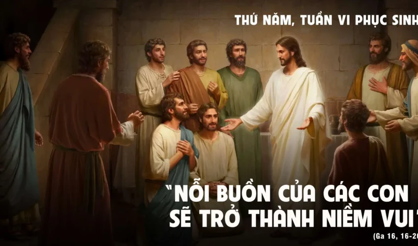 Chúa Giêsu nhận thấy họ muốn hỏi Người, nên Người bảo họ: “Các con hỏi nhau vì Thầy đã nói: Một ít nữa các con sẽ không thấy Thầy, rồi lại một ít nữa các con sẽ thấy Thầy. Thật, Thầy bảo thật với các con: các con sẽ than van khóc lóc, còn thế gian sẽ vui mừng. Các con sẽ buồn sầu; nhưng nỗi buồn của các con sẽ trở thành niềm vui”.